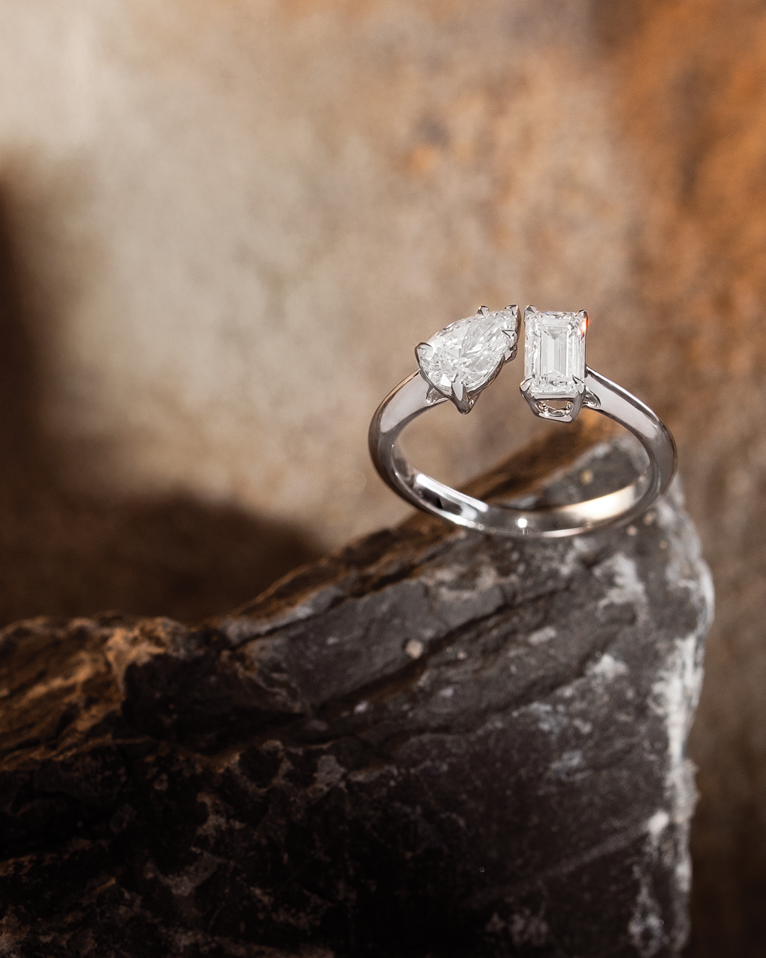Cincin klasik dengan dua berlian pear & emerald shape in D color VVS clarity, mulai dari 0.30 carat.
