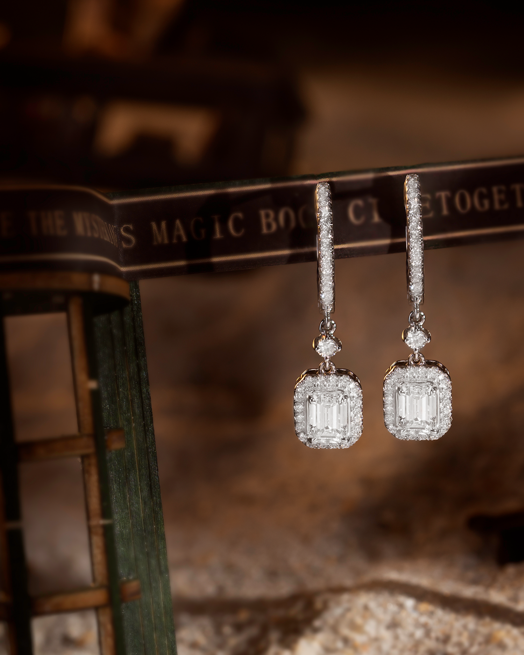 Anting dangling dengan center diamond emerald in D color VVS clarity, mulai dari 0.50 carat.
