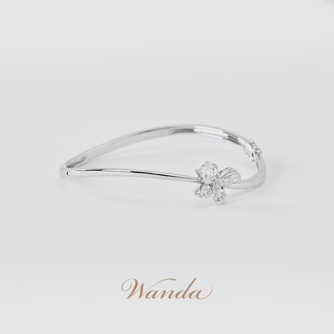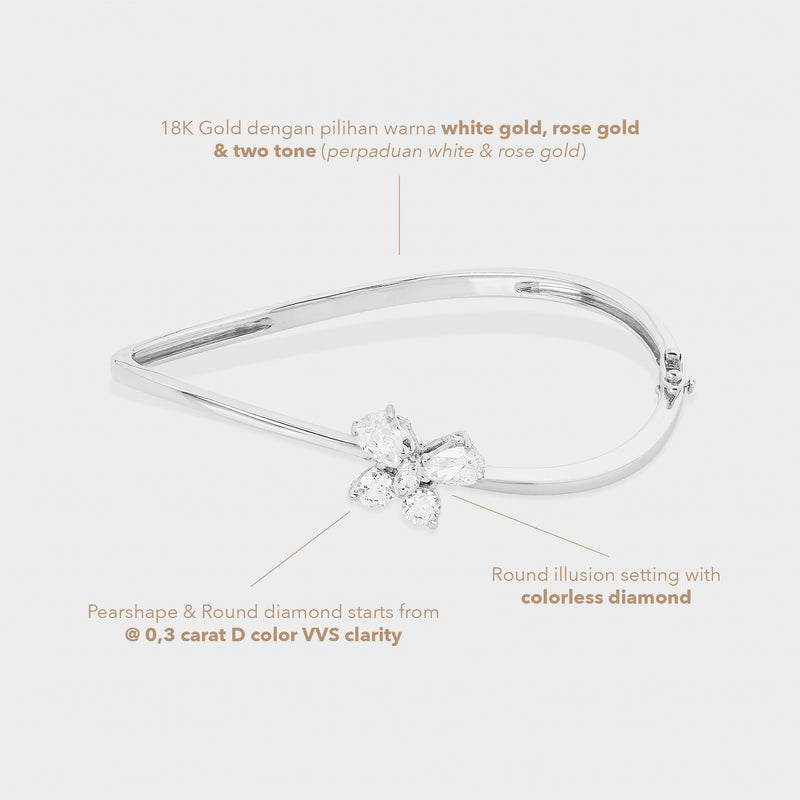 Bangle emas 18K berhiaskan berlian D Color VVS Clarity mulai dari 0.30 carat dengan desain kupu-kupu bergaya fantasi. Sentuhan fairytale elegan untuk tampilan yang anggun dan berkelas.