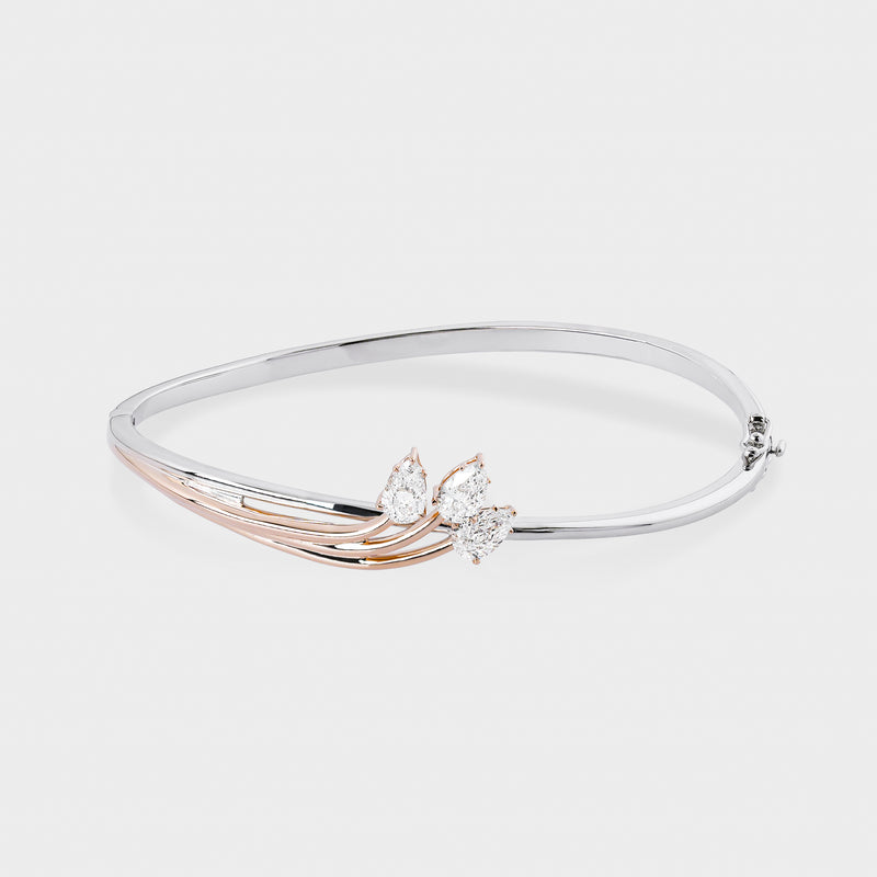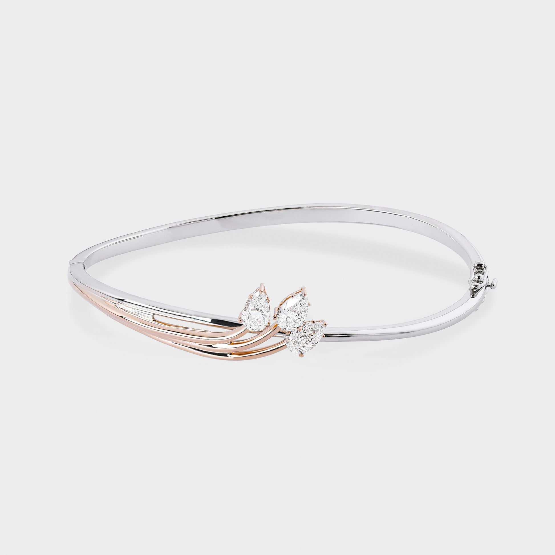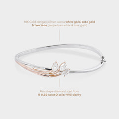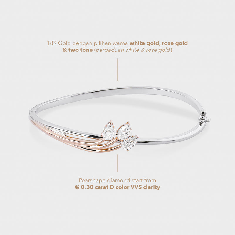 Gelang bangle emas 18K bertema maple, dihiasi tiga berlian D Color VVS Clarity berbentuk pear, menciptakan kesan elegan dan unik. Ideal untuk sentuhan mewah di setiap penampilan.