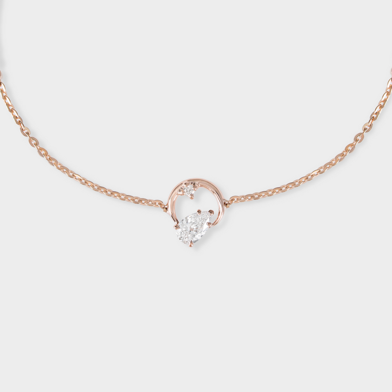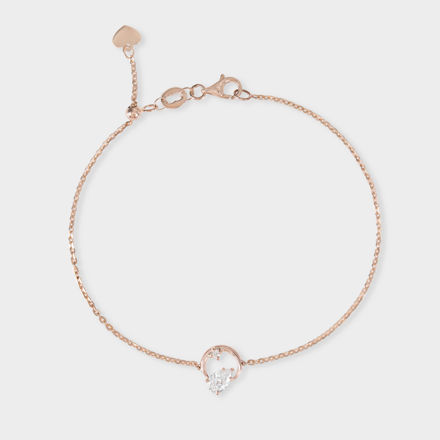 Gelang emas 18K bertabur berlian D Color VVS Clarity mulai 0.20 carat, tersedia dalam varian bentuk pear cut dan ascher cut yang menghadirkan tampilan elegan dengan pantulan cahaya yang tegas serta dihadirkan dalam rose gold yang manis, gelang ini menonjolkan kilau jernih colorless diamond dan desain simpel nan berkelas sempurna untuk menambah sentuhan feminin dan modern pada gaya sehari-hari.