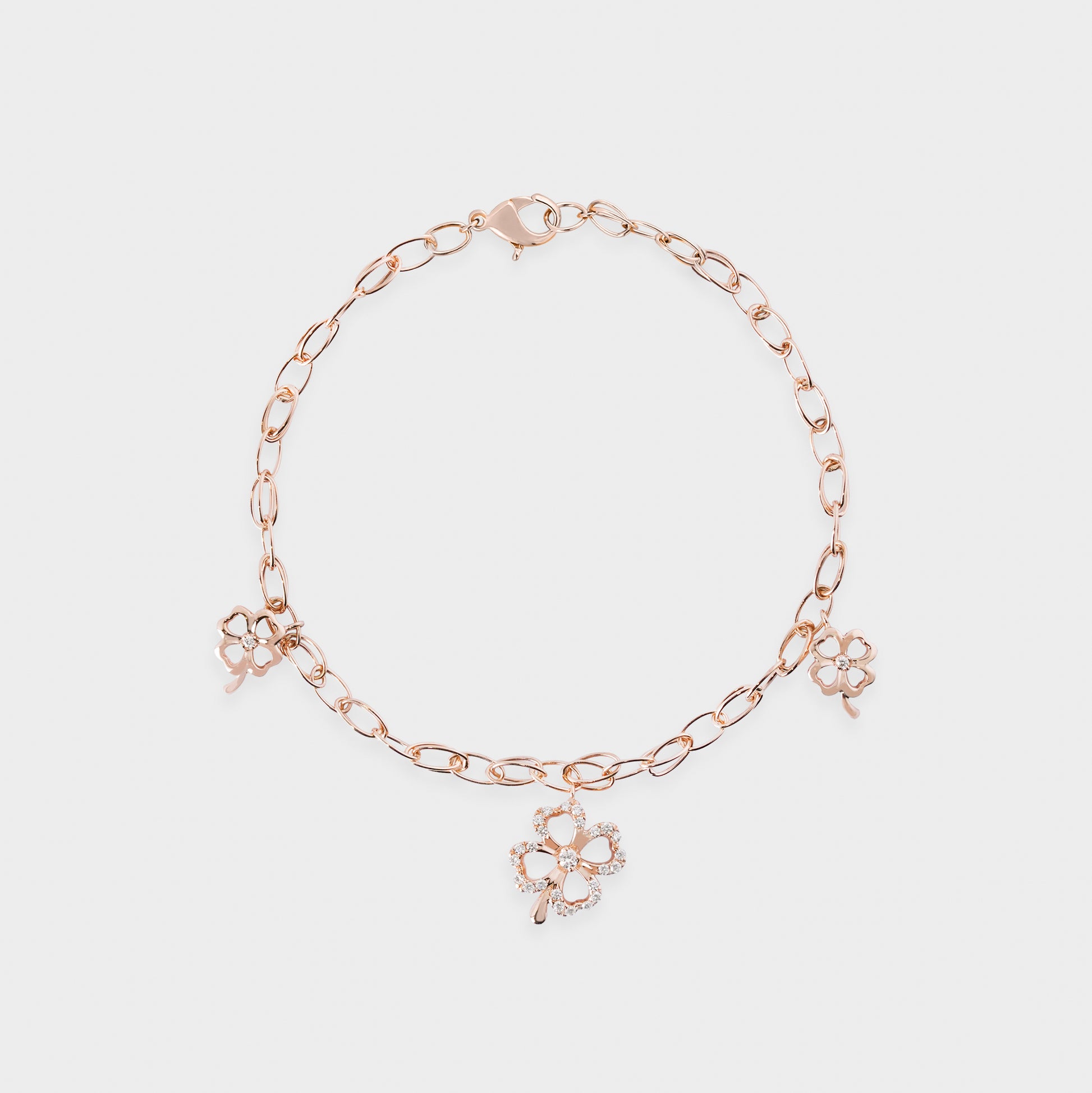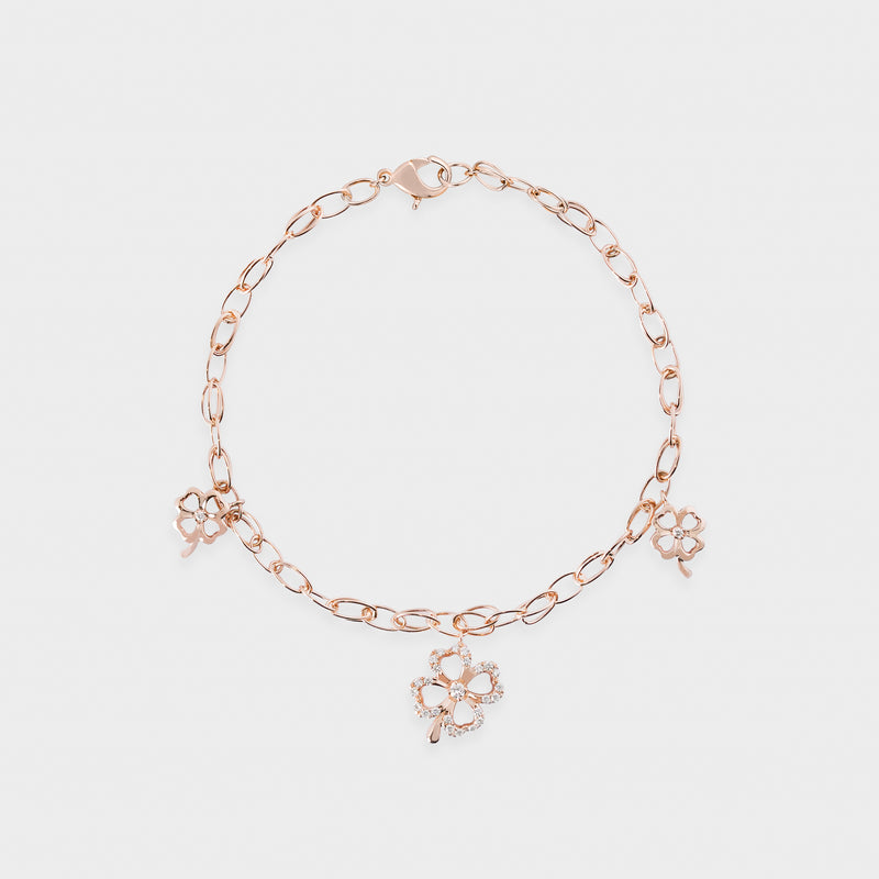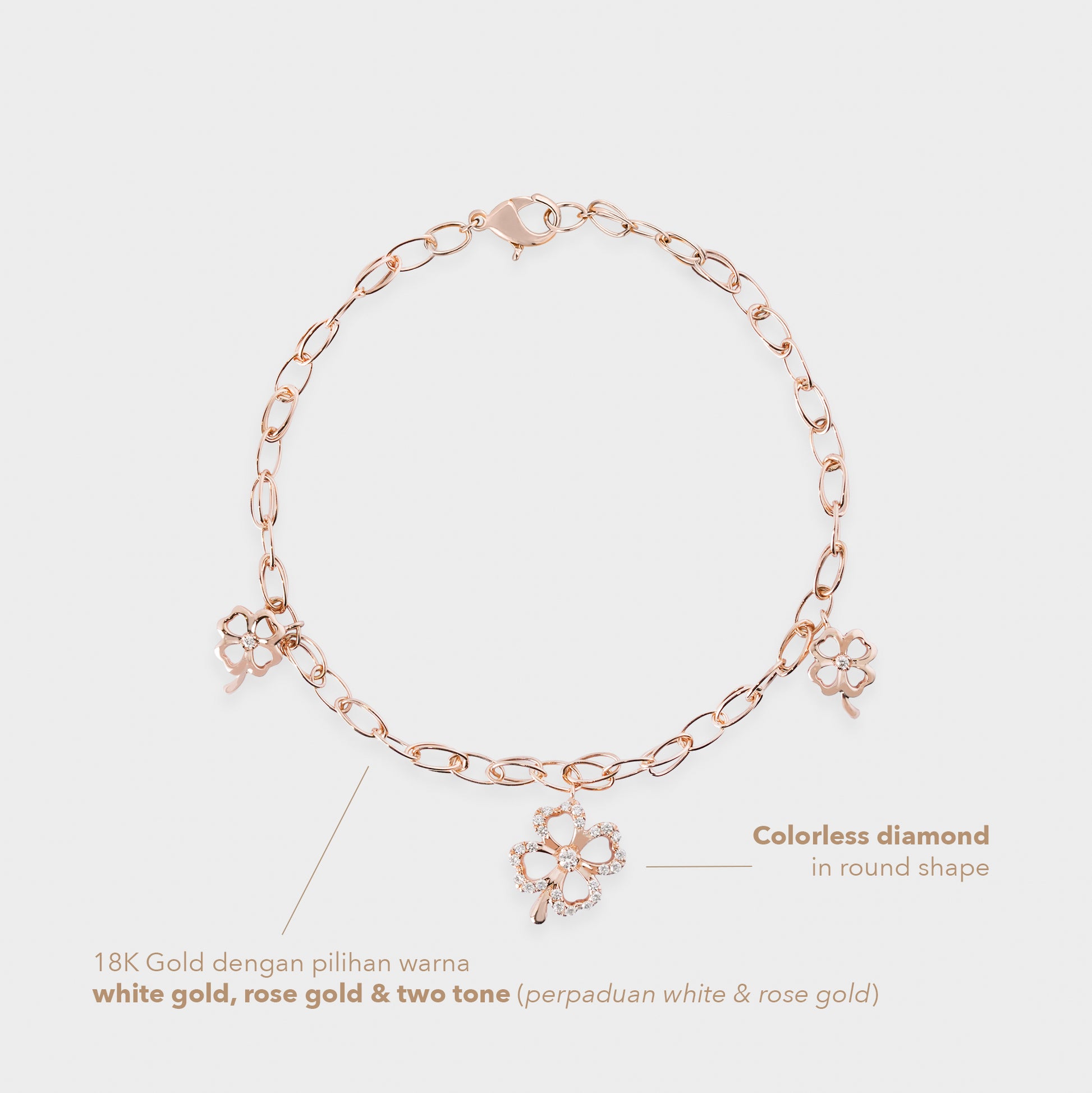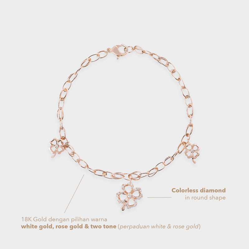 Gelang emas 18K Rose Gold ini menampilkan motif empat kelopak clover yang melambangkan keberuntungan. Dihiasi round cut colorless diamond dalam micro setting, gelang ini memancarkan kilau lembut yang elegan tanpa kesan berlebihan. Desainnya yang simpel namun chic menjadikannya aksesori serbaguna ideal dikenakan setiap hari maupun di momen istimewa.