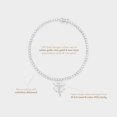 Clover 3.3 Bracelet adalah gelang emas 18K yang memadukan simbol keberuntungan dengan kemewahan. Dihiasi berlian natural D Color VVS Clarity berbentuk heart cut (colorless diamond) dan detail diamond micro setting, desainnya tampil anggun dan menawan. Pilihan sempurna untuk gaya feminin yang elegan di setiap kesempatan.