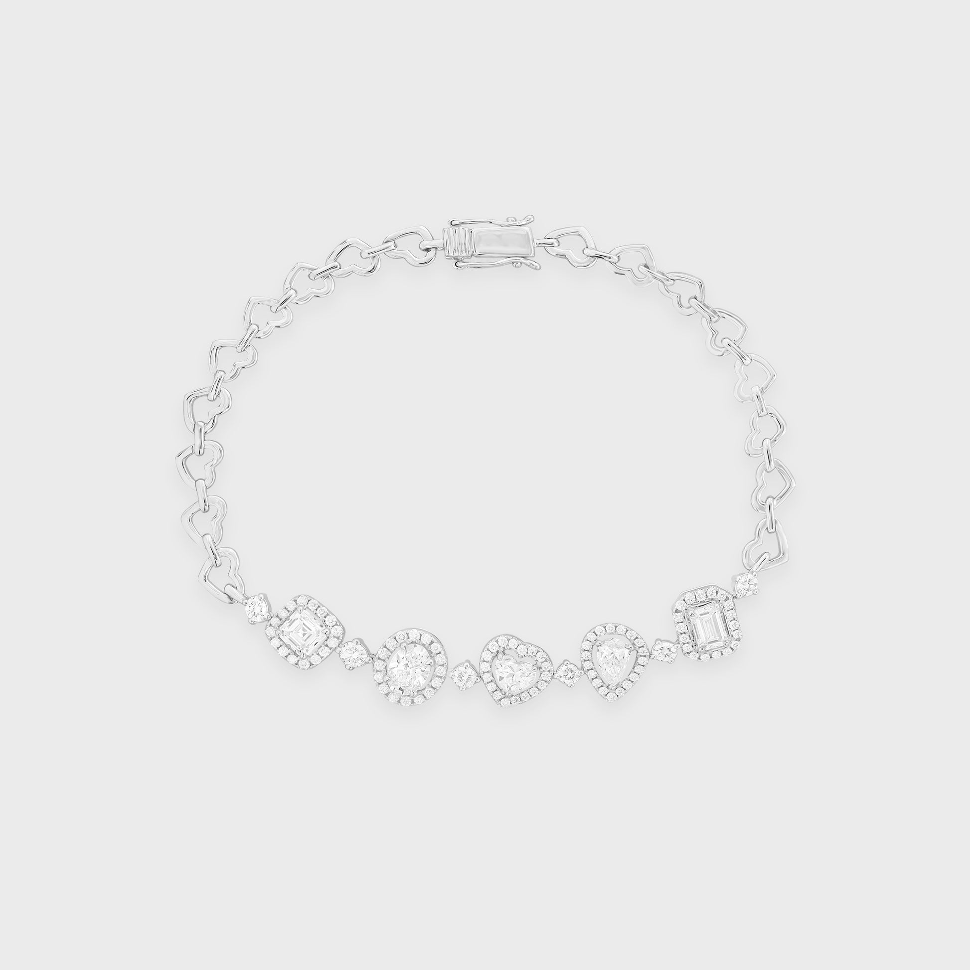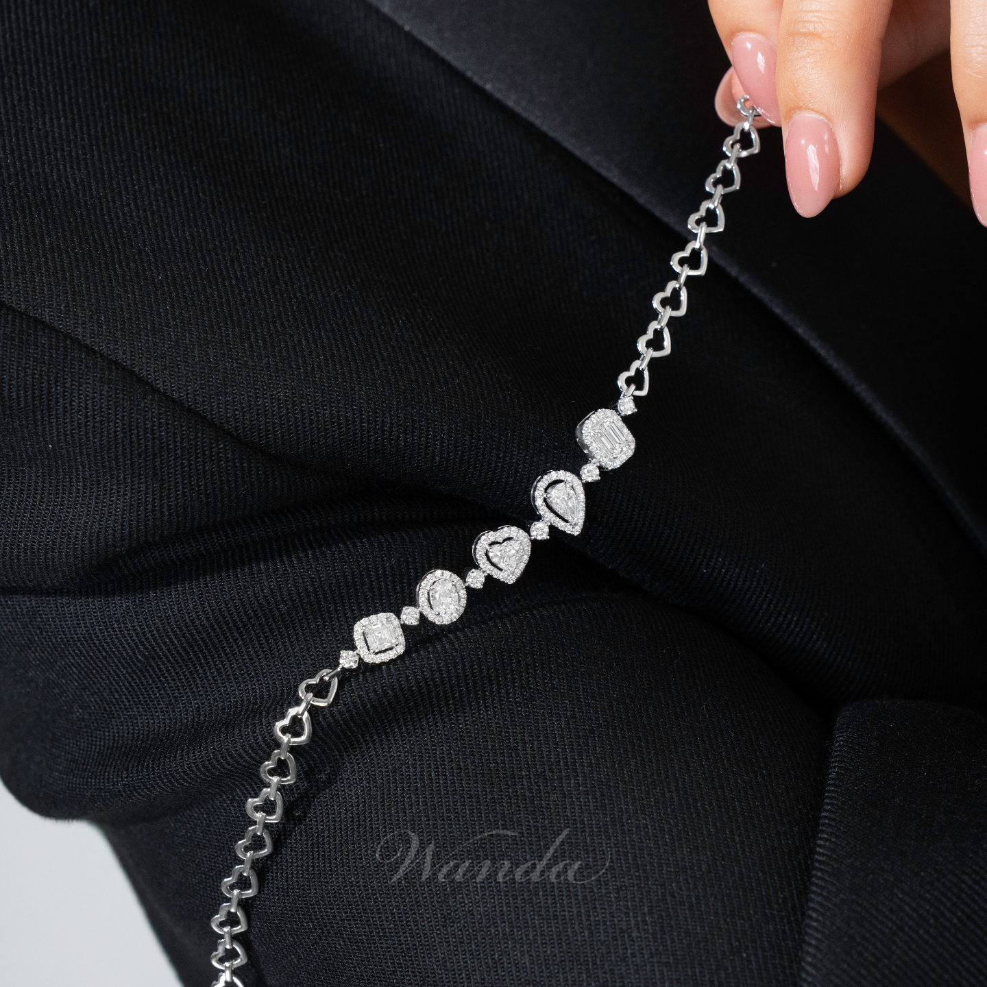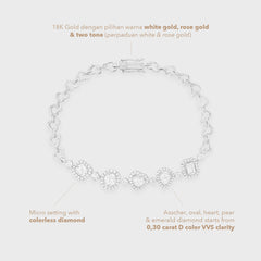 Bracelet Jovana adalah gelang emas 18K dengan desain elegan dan minimalis, dihiasi berlian multishape D Color VVS Clarity (colorless diamond). Kombinasi potongan berlian yang beragam memberikan tampilan dinamis namun tetap anggun, diperindah dengan detail diamond mikro setting untuk kilau ekstra yang memikat. Cocok untuk melengkapi gaya sehari-hari hingga momen spesial.