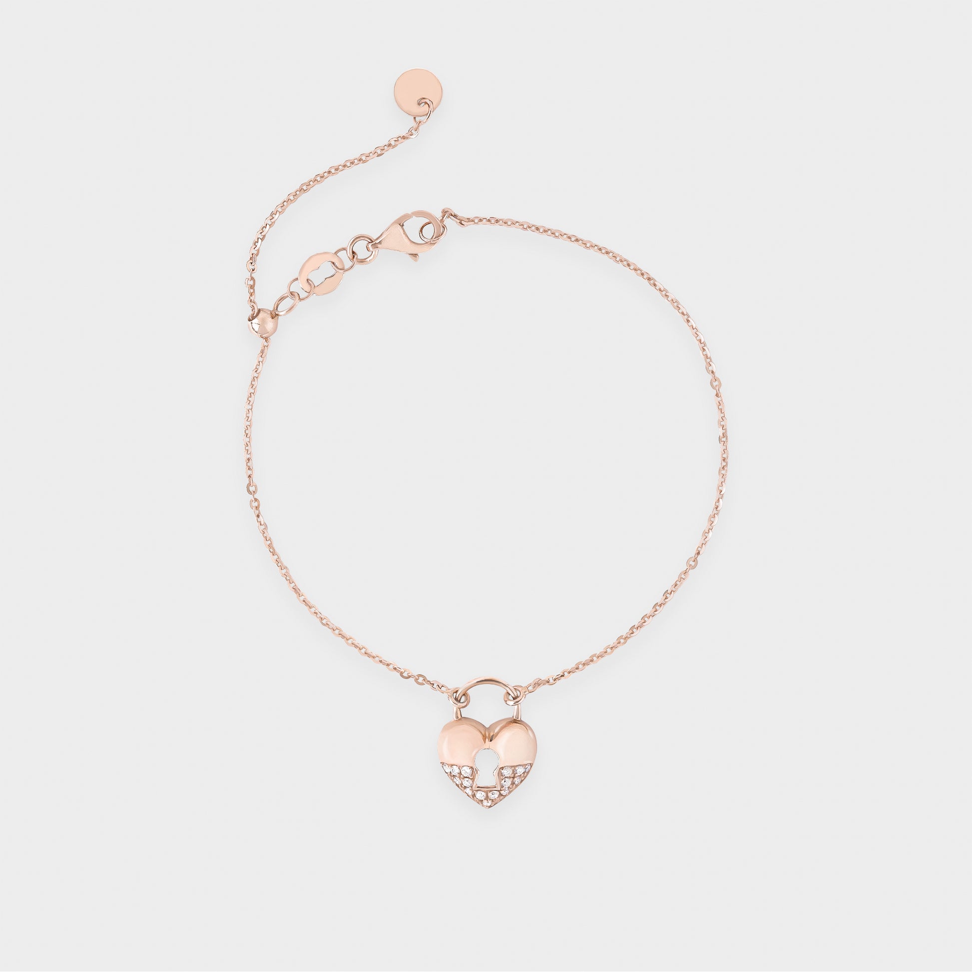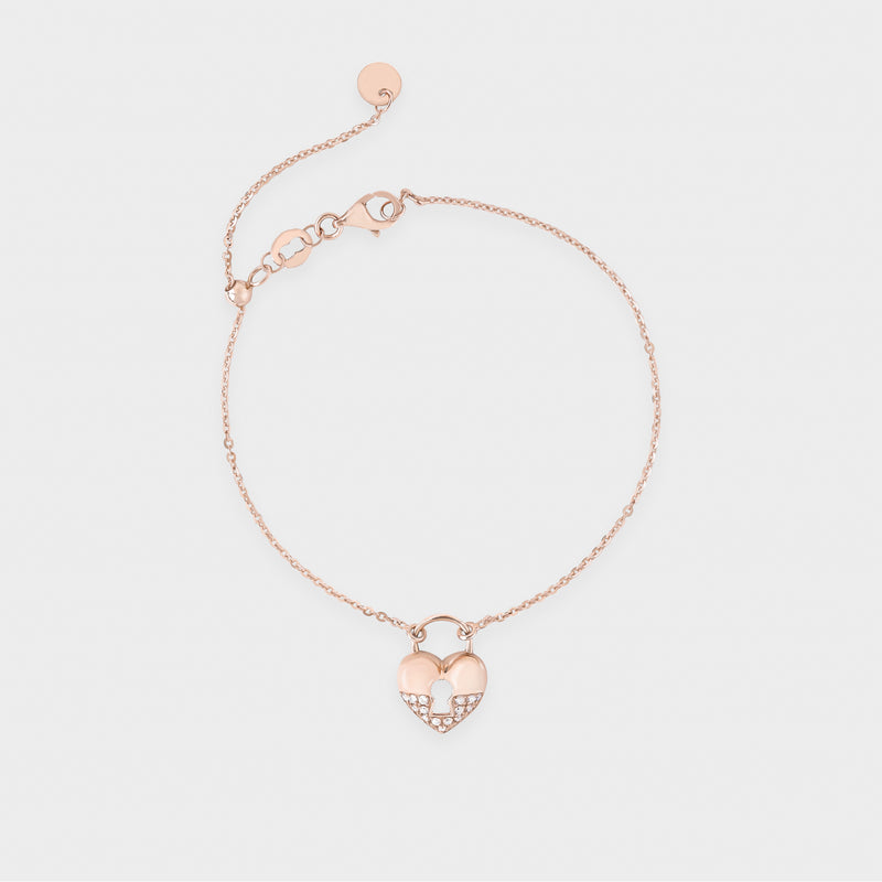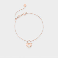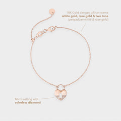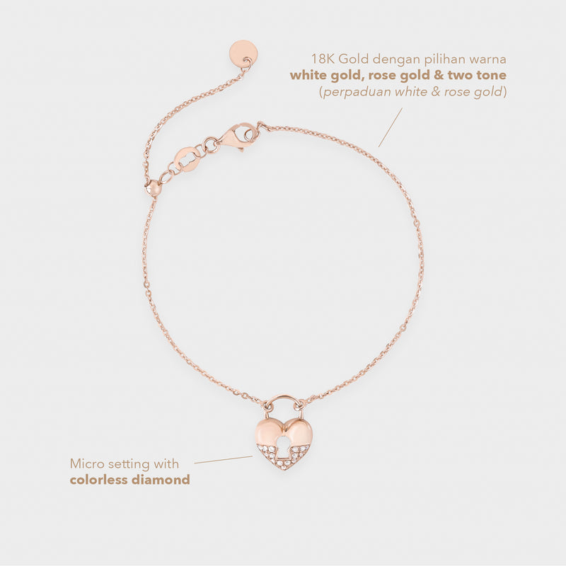 Gelang emas 18K rose gold dihiasi gembok ikonik, mewakili simbol cinta dan perlindungan. Desain chic, fun, dan penuh makna sempurna untuk menambah sentuhan manis pada penampilan sehari-hari atau momen spesial.