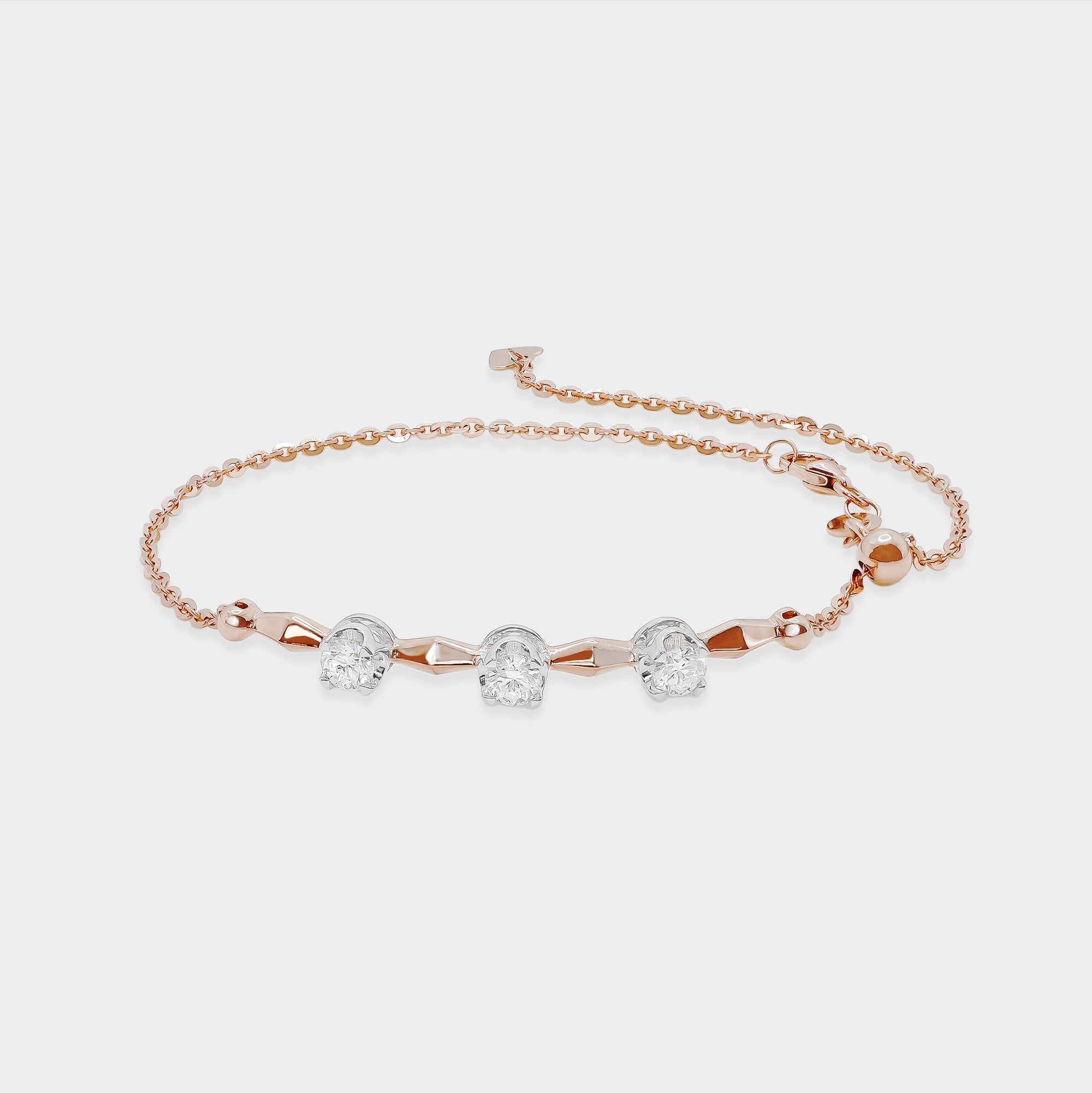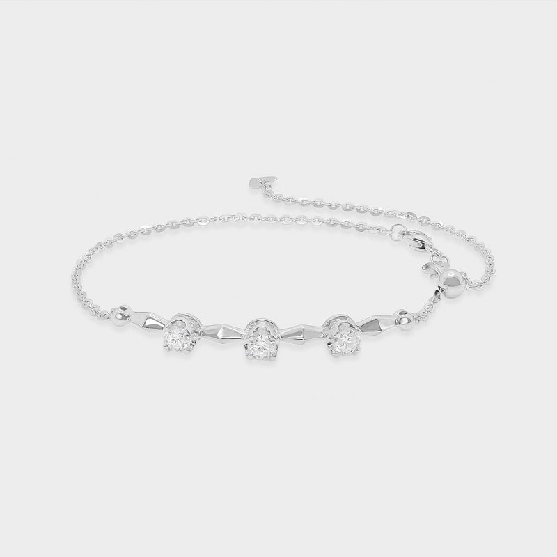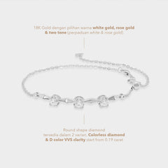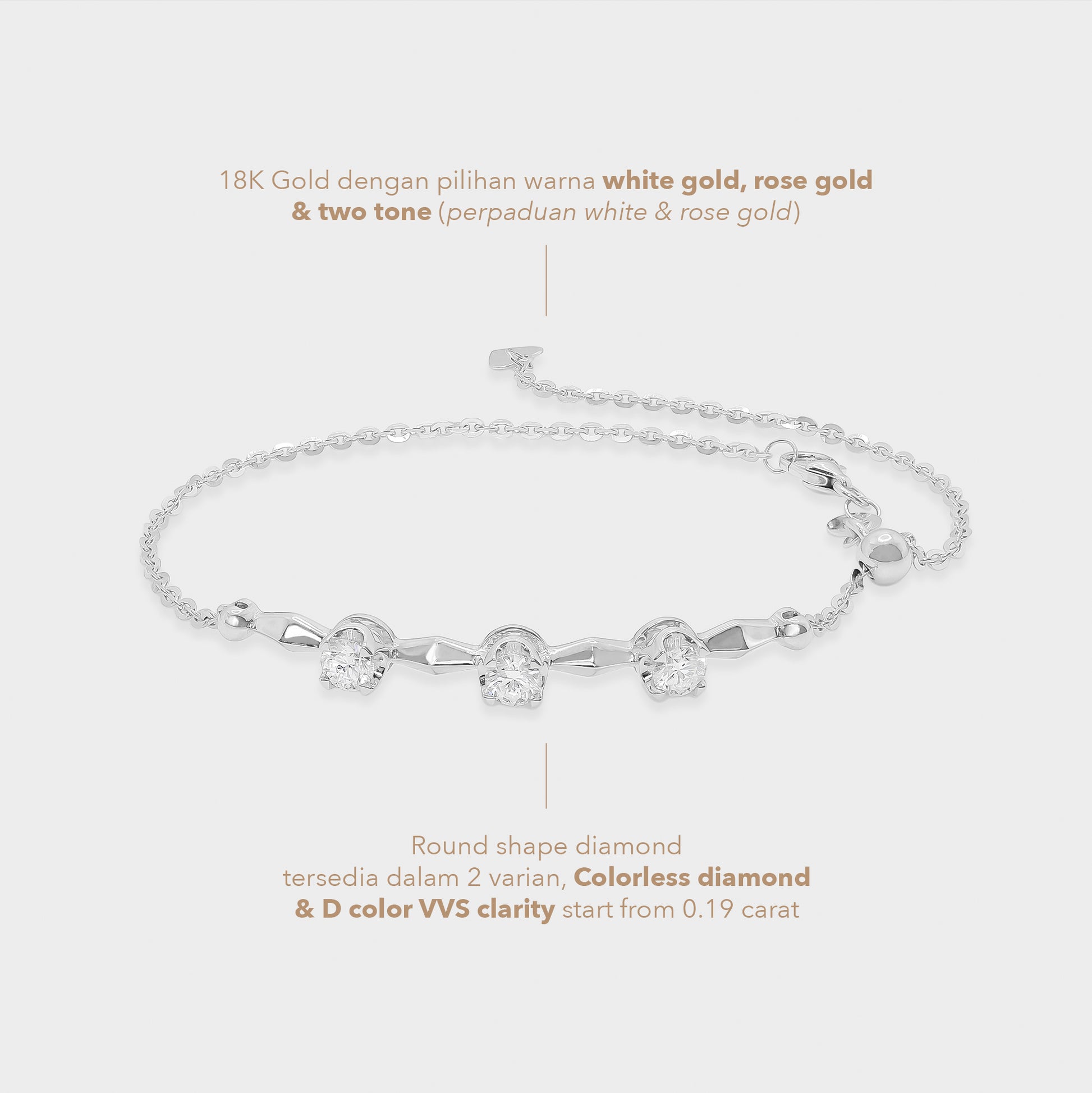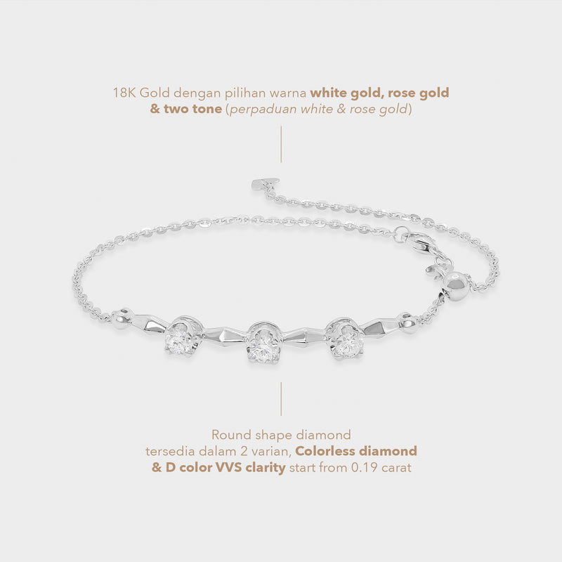 Gelang elegan ini dihiasi tiga berlian round cut D Color VVS Clarity (colorless diamond) mulai dari 0.19 carat, melambangkan masa lalu, kini, dan masa depan. Desain minimalis nan bermakna ini tersedia dalam dua varian warna: white gold dan two tone, menjadikannya simbol cinta abadi yang anggun dan penuh makna.