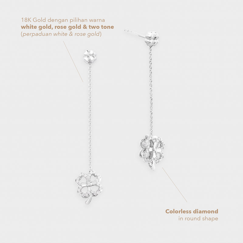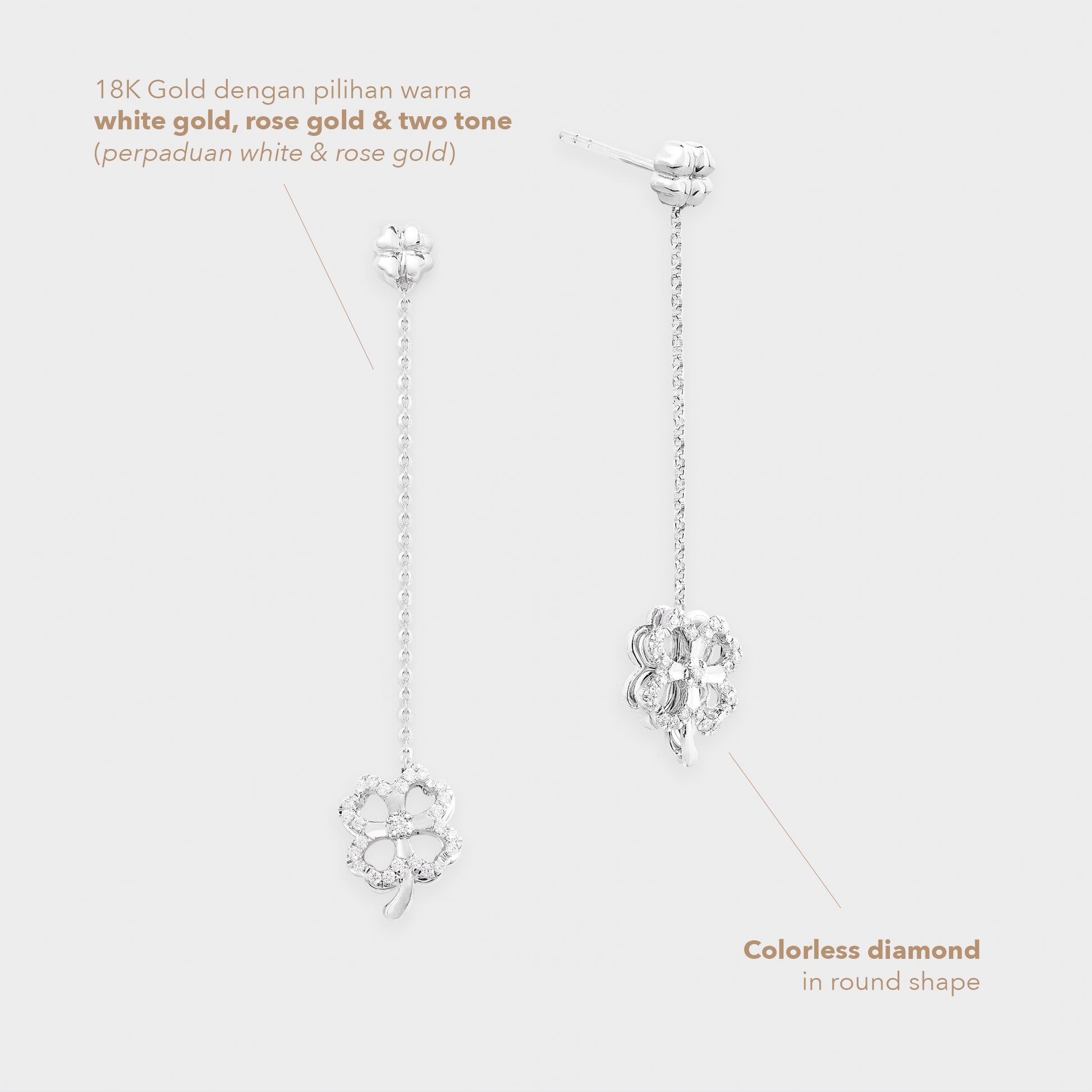 Clover 1.1 Earrings menampilkan desain drop yang manis dan feminin dengan siluet clover yang elegan. Dihiasi dengan colorless diamond micro setting, anting emas 18K ini memancarkan kilau lembut dari setiap sudut. Desainnya menghadirkan keseimbangan antara keanggunan klasik dan gaya modern, cocok untuk menambah pesona dalam setiap momen.