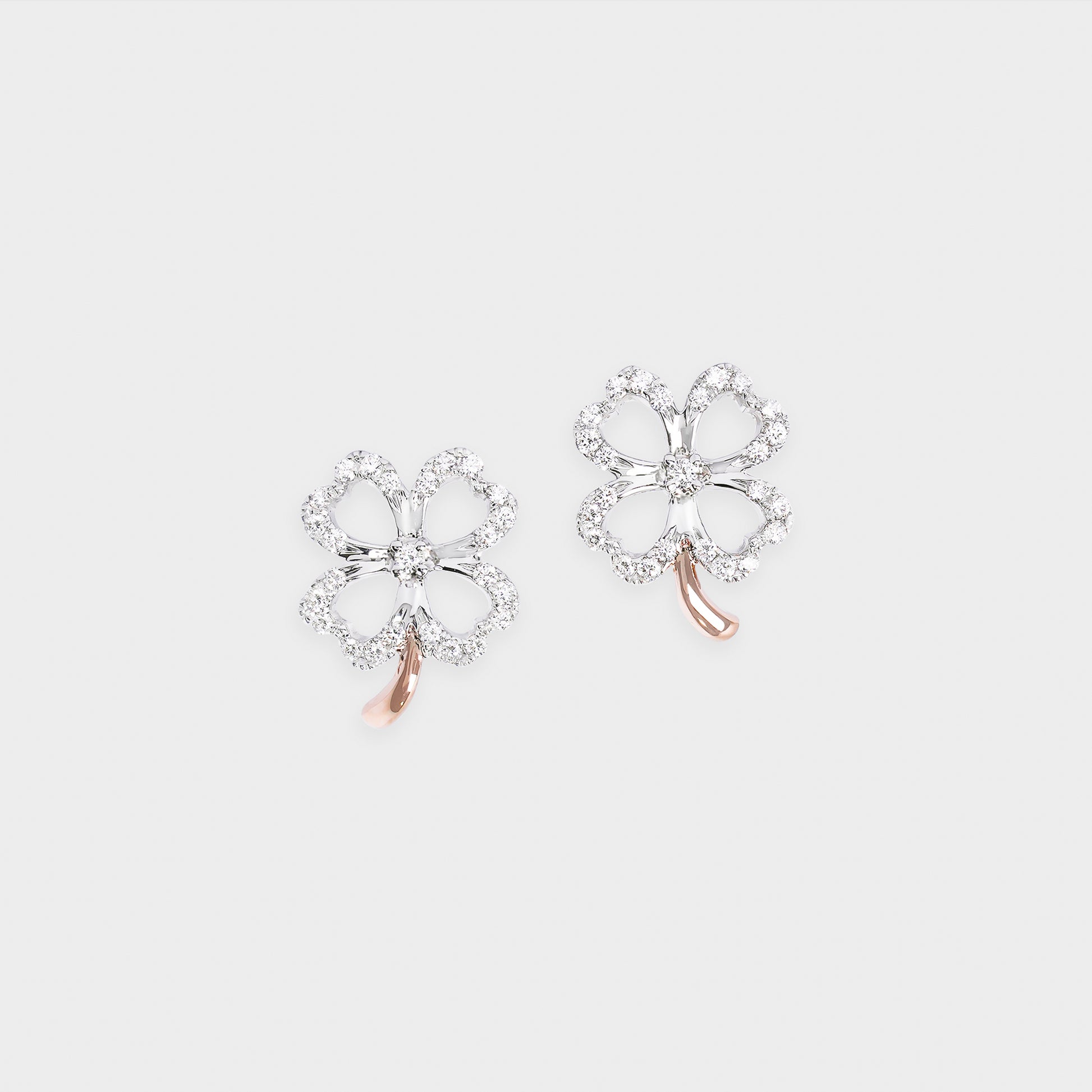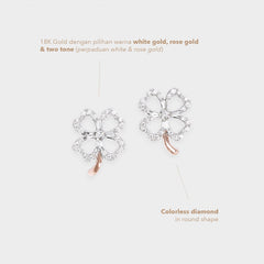 Anting Clover 2.0 stud emas 18K dengan motif empat kelopak clover yang feminin dan bermakna. Dihiasi round cut colorless diamond dalam micro setting, memberikan kilau lembut yang elegan. Desainnya yang chic dan timeless cocok untuk tampilan sehari-hari maupun acara spesial, sekaligus menjadi simbol keberuntungan yang stylish.