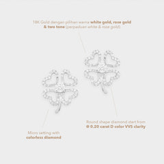 Clover 2.1 Earrings menghadirkan sentuhan elegan melalui berlian round cut D Color VVS Clarity sebesar 0.23 carat (colorless diamond) di setiap sisi. Dipadukan dengan detail micro setting diamond yang memperkaya kilaunya, anting emas 18K ini menawarkan desain mewah yang tetap ringan dan feminin sempurna untuk gaya harian maupun hadiah istimewa penuh makna.