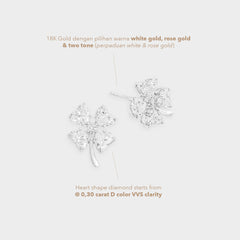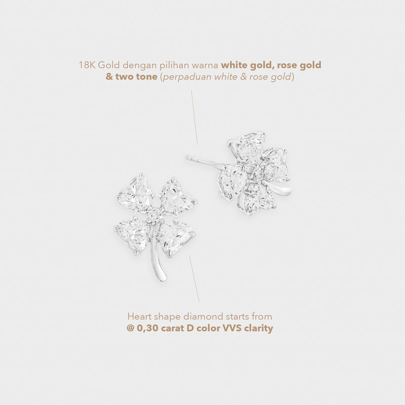 Anting emas Clover 3.0 18K dengan heart cut diamond D Color VVS Clarity 0.3 ct, dihiasi colorless diamond. Hadir dalam varian stud dan dangle, simbol keberuntungan yang elegan untuk gaya sehari-hari maupun spesial.