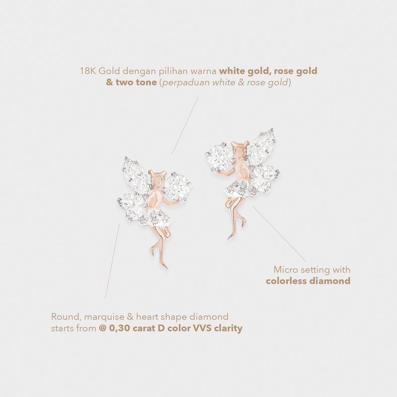 Fairytale Jolene Earrings menghadirkan kilau menawan dari tiga bentuk berlian D color VVS clarity (colorless diamond): round, heart, dan marquise. Dibalut emas 18K dan dihiasi diamond mikro setting, desainnya memadukan kesan anggun dan bold khas dunia dongeng.
