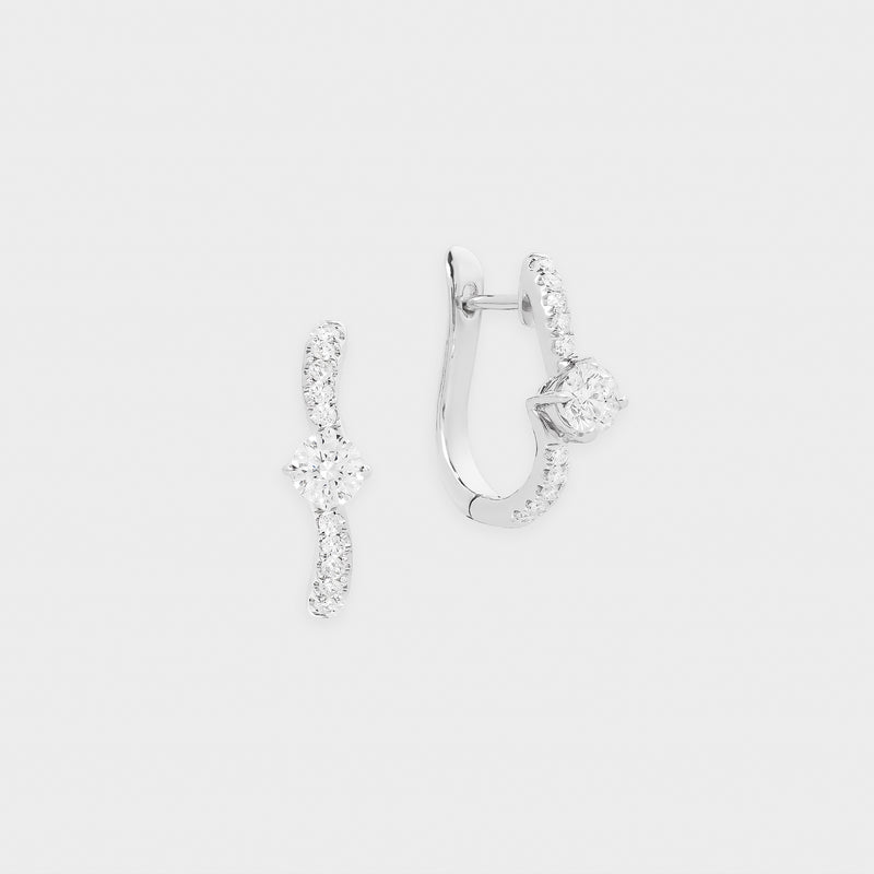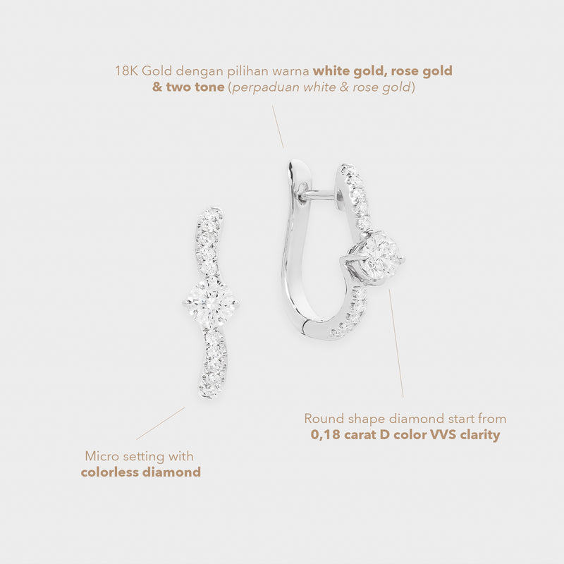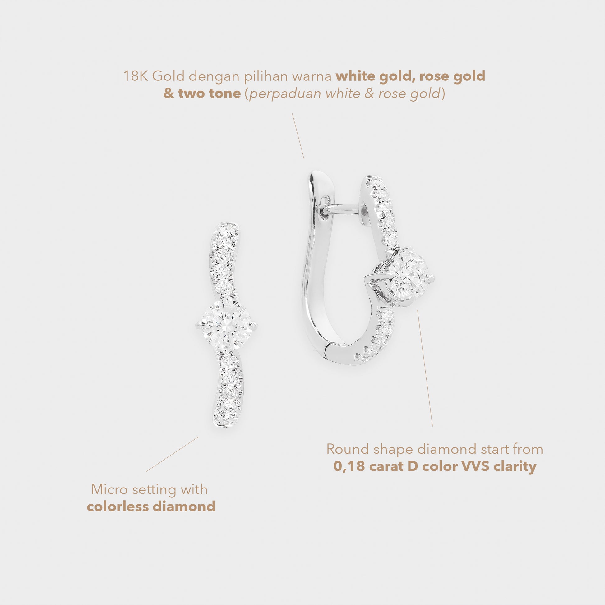 Anting emas 18K dengan berlian round cut D color VVS clarity mulai dari 0,18 carat, dihiasi diamond mikro setting. Desain asimetrisnya tampil bold sekaligus elegan.