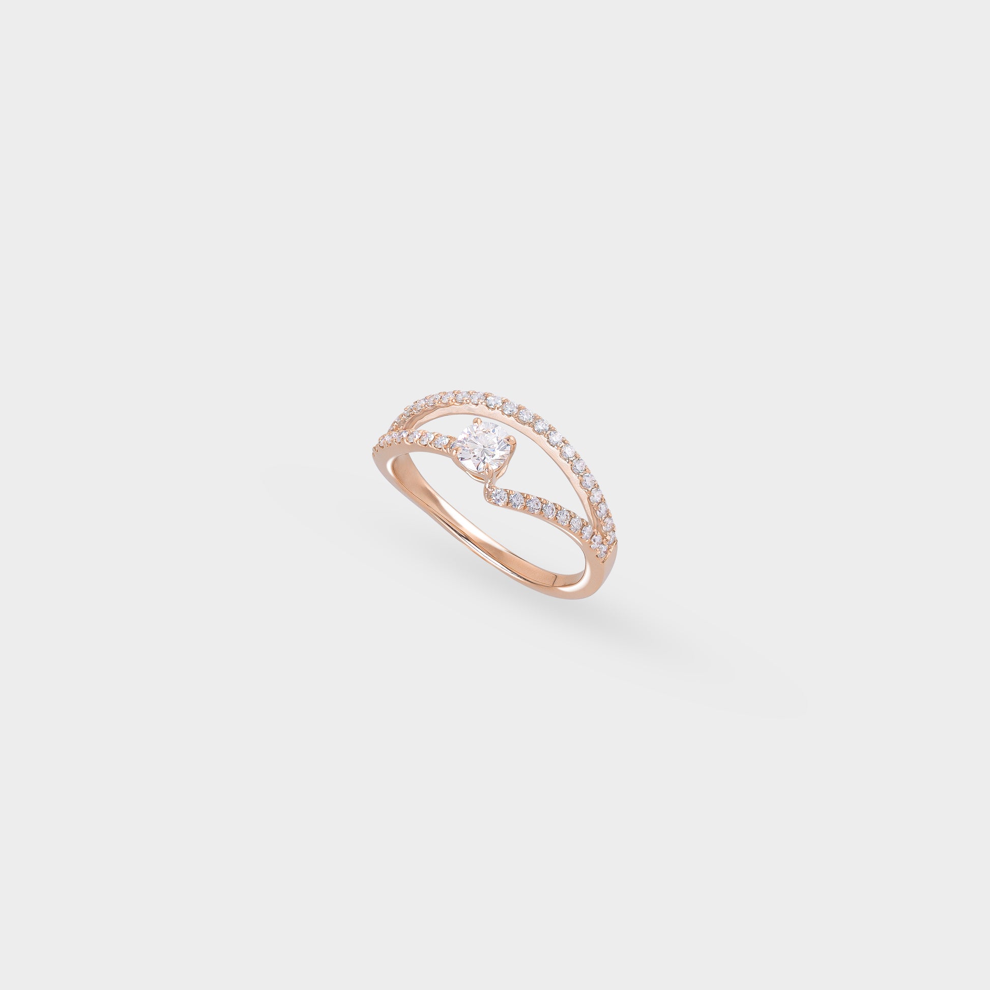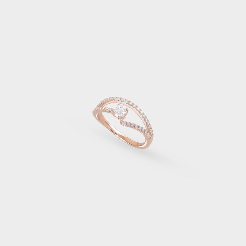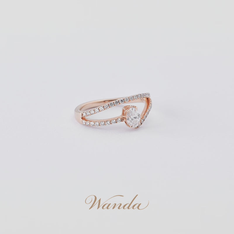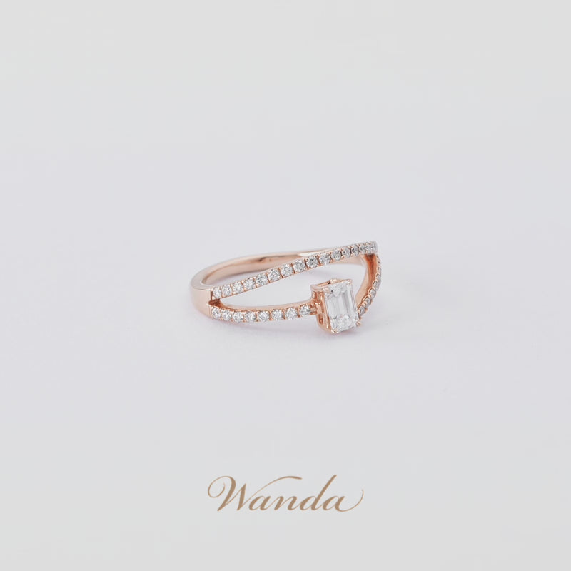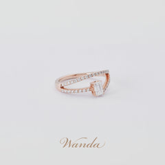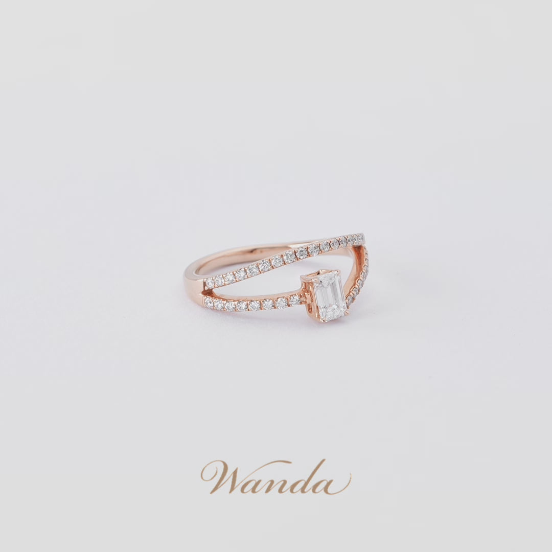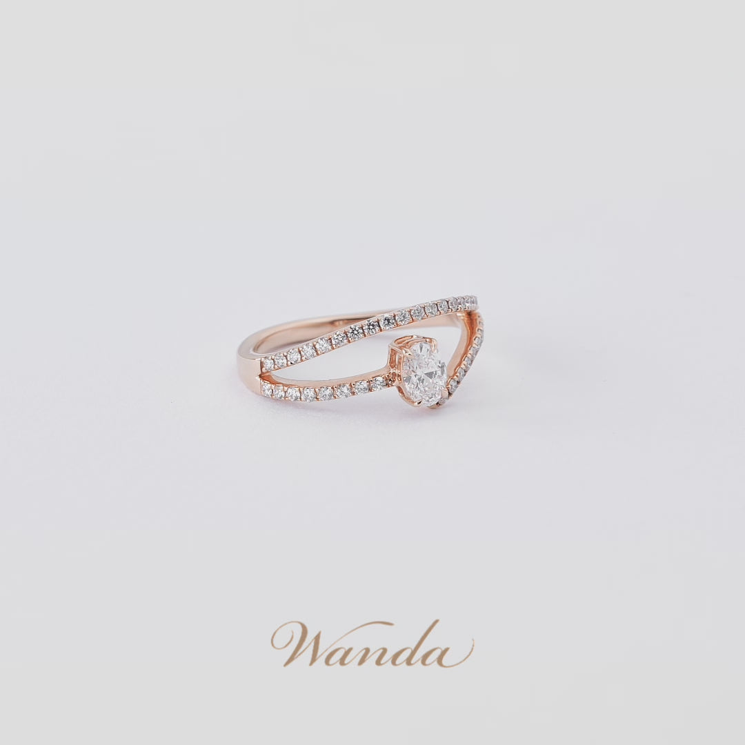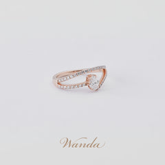 Cincin Nirmala asimetris dengan desain split band elegan, dihiasi tiga berlian utama berbentuk oval, emerald, dan heart cut (masing-masing 0.3 carat) dengan grade D Color VVS Clarity. Dilengkapi colorless diamond micro setting, cincin ini memadukan kilau mewah dan desain modern yang feminin.