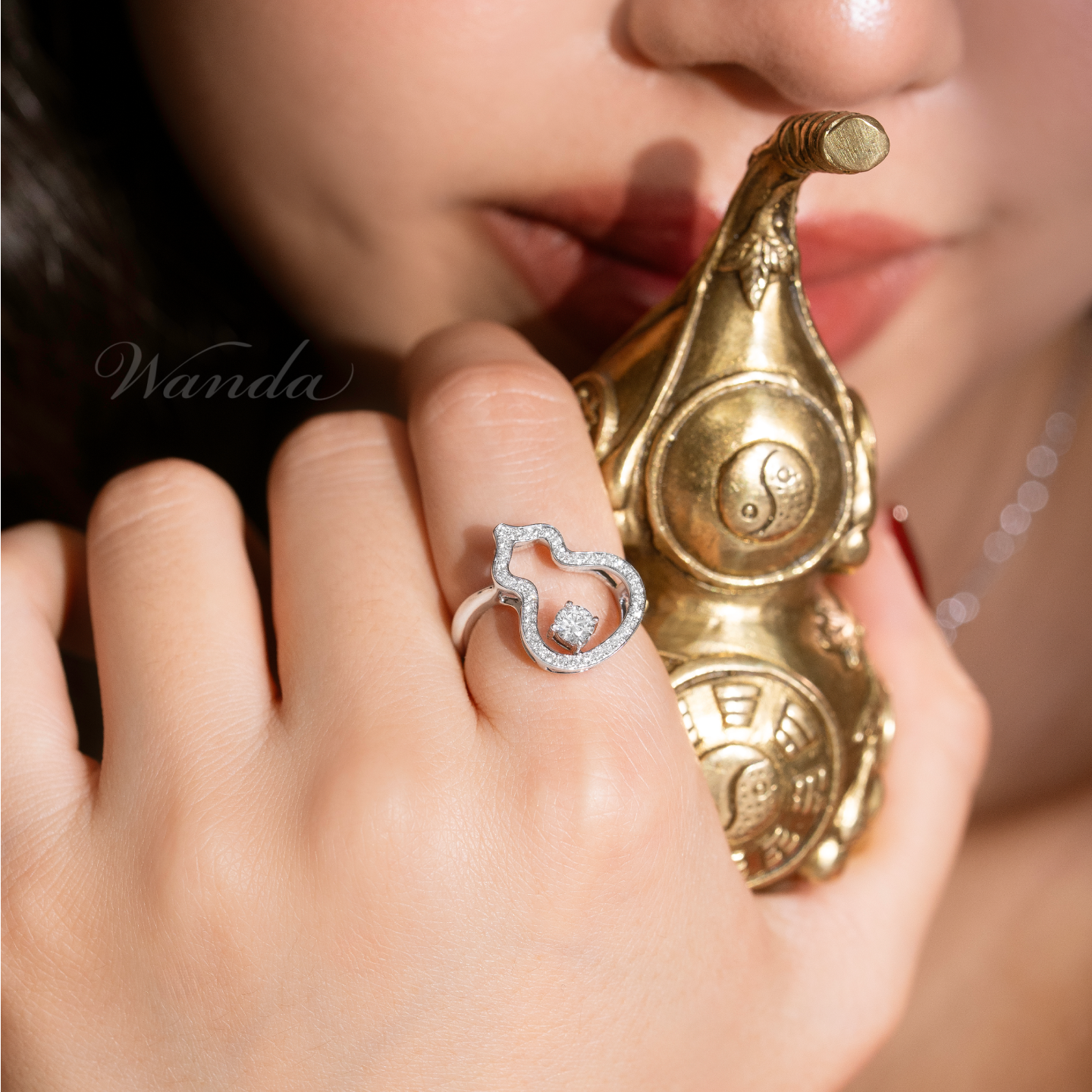 Cincin emas 18K yang memadukan elegansi dan filosofi mendalam. Dihiasi berlian utama berbentuk round cut (0.20 carat) dengan kualitas tertinggi D Color dan VVS Clarity yang memancarkan kilau sempurna. Barisan mikro setting colorless diamond di sekelilingnya menambah efek kilau dari setiap sudut. Desainnya terinspirasi dari simbol Wulou, melambangkan keberuntungan, perlindungan, dan harmoni dalam balutan gaya modern yang anggun.