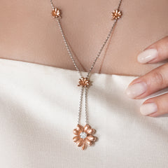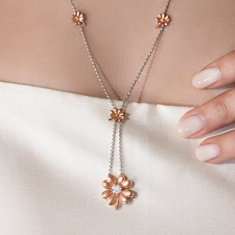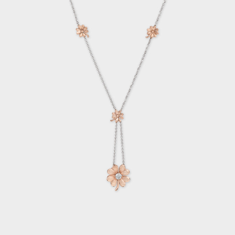 Kalung Clover Self Made menampilkan motif empat kelopak clover yang melambangkan keberuntungan. Dihiasi round cut diamond in D color VVS clarity mulai dari 0.18 carat, memberikan kilau halus namun elegan. Desainnya chic dan timeless, cocok dikenakan sehari-hari maupun untuk momen spesial.