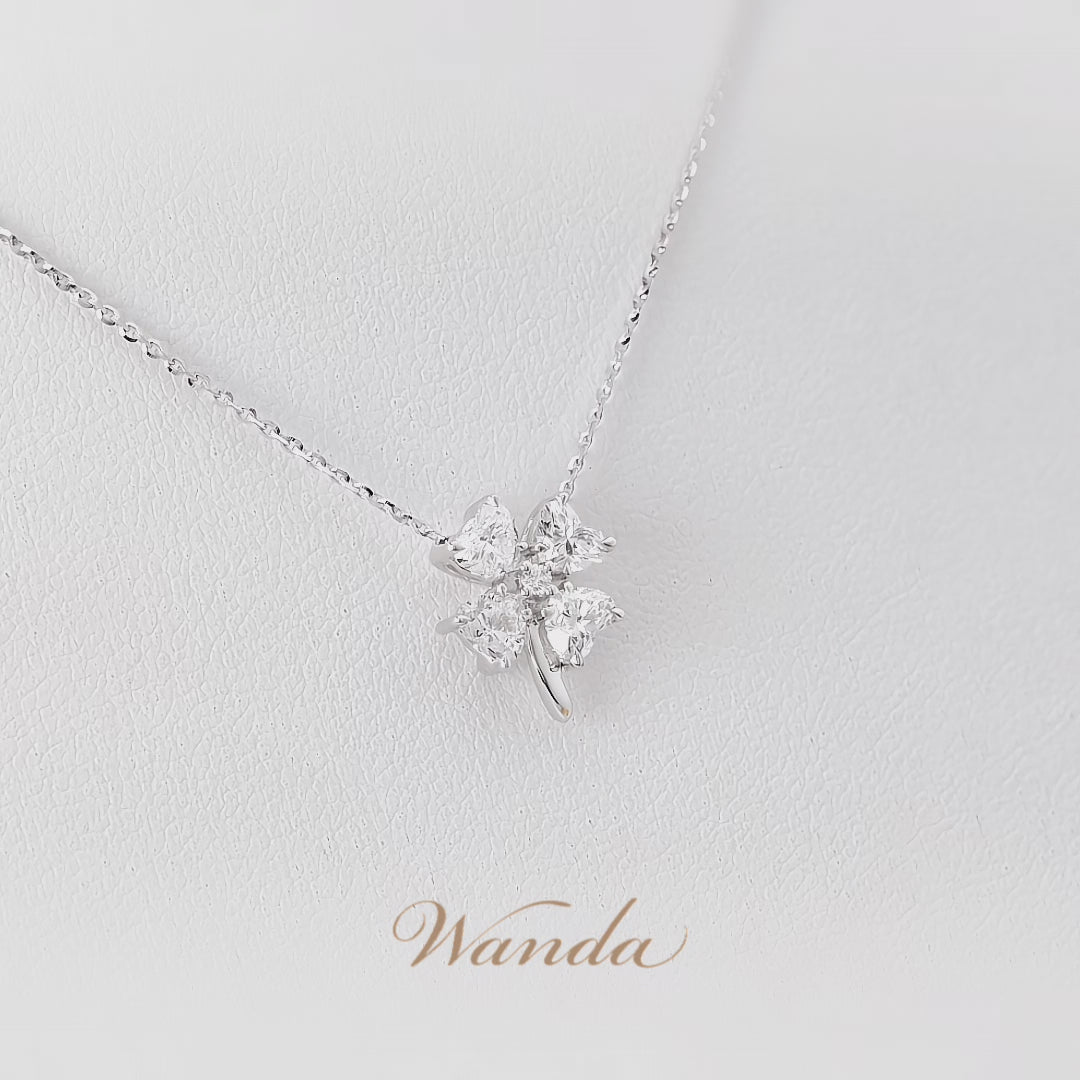 Liontin emas 18K dengan empat berlian D color VVS Clarity heart shape mulai 0.30 carat, membentuk motif clover yang menggambarkan keberuntungan, elegan dan bermakna.